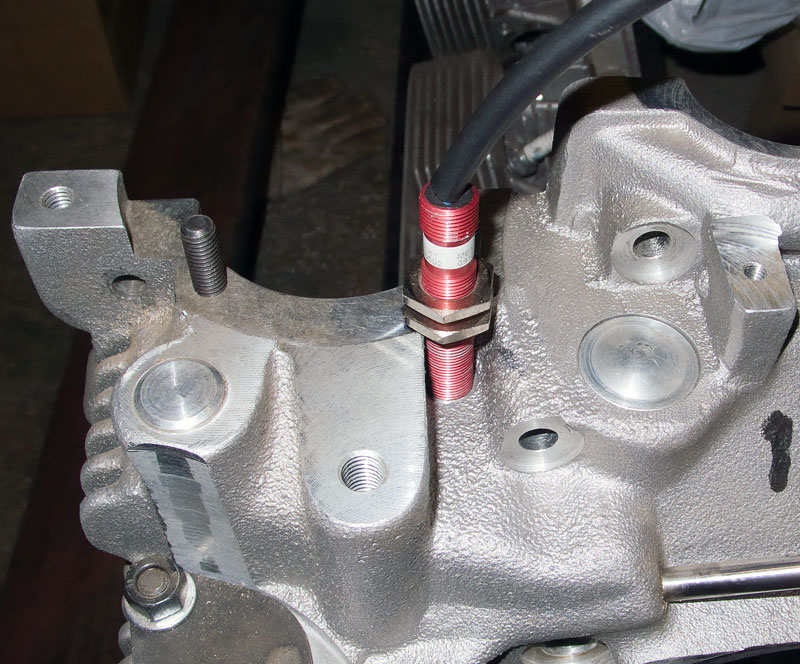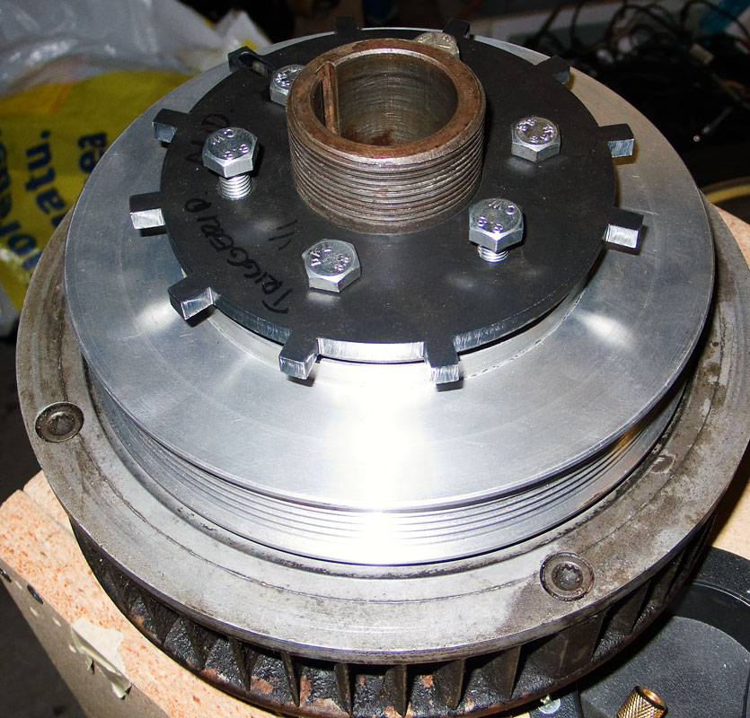 Crankshaft trigger plate mounted to Type 3 engine's fan pulley plug.
