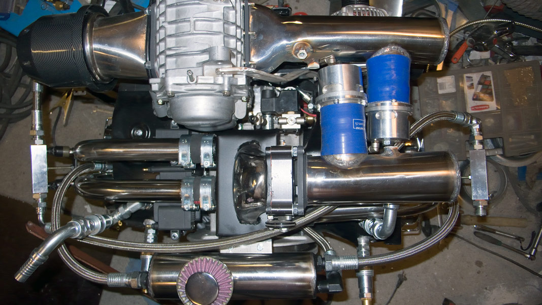 Watercooled intercooler and two 50mm popoff-valves.